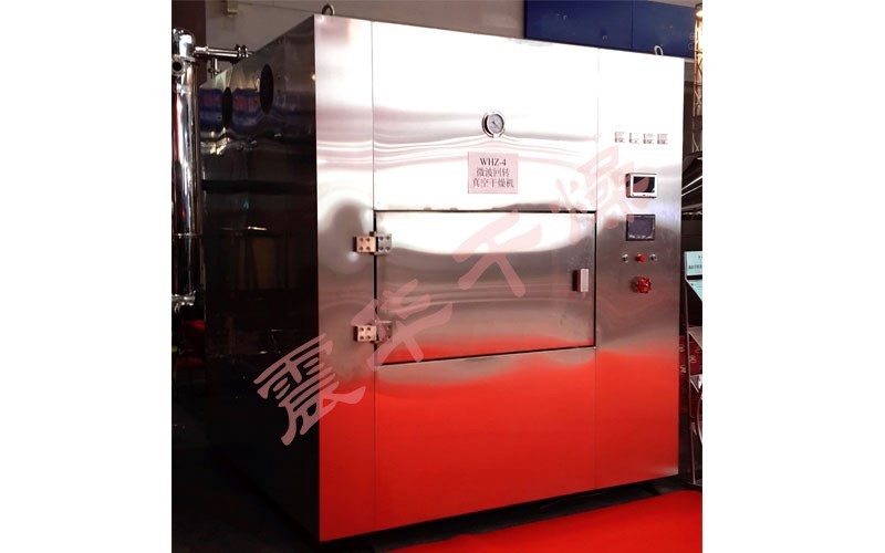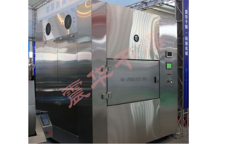 物料在真空狀態下,置放在作回轉運動的吊架上,吸收微波能量,使物料內部水分在低溫狀態下迅速蒸發,達到干燥目的。